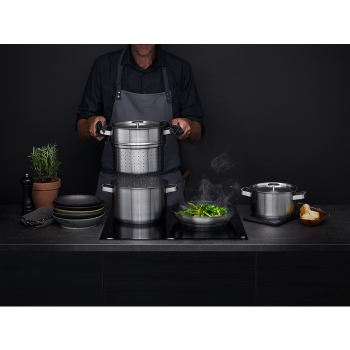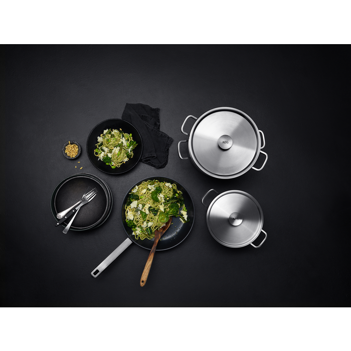 De alles-in-één pannenset van AEG biedt eindeloze opties voor maaltijden. Hij bestaat uit een koekenpan van 28 cm met antiaanbaklaag, een pan van 4 l en een grotere van 6 l met bijpassende deksels en een roestvrijstalen pastazeef. Alles wat u nodig heeft om alledaags koken effectiever te maken.