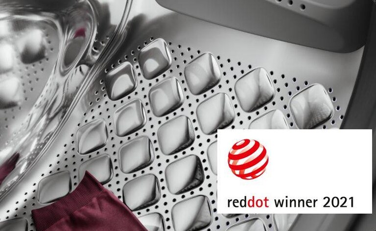Red dot Award 2021 voor nieuwe trommel ontwerpKledingstukken glijden soepel dankzij het verhoogde kussenachtige trommelpatroon en de geoptimaliseerde hefschoep. Een dun laagje water bedekt de gaten tijdens het wassen. Voor een zachte waservaring met minder slijtage van de stoffen.
