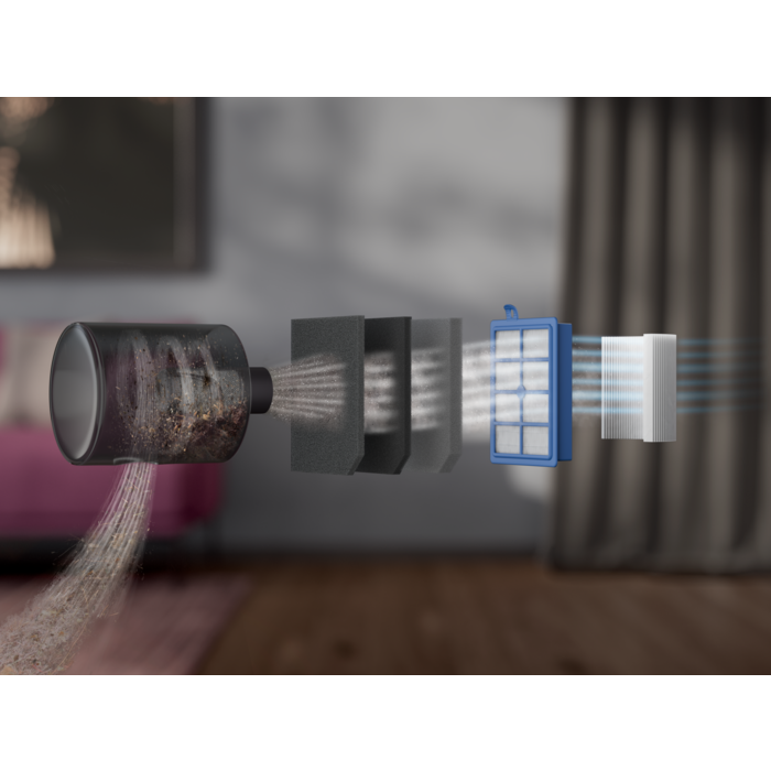 Het HEPA-filtratiesysteem kan tot 99,999%* van de deeltjes tot maar liefst 0,3 micron filteren. Dat is de grootte van fijn stof, huisstofmijten en allergenen. Zo ontstaat een schonere lucht.
