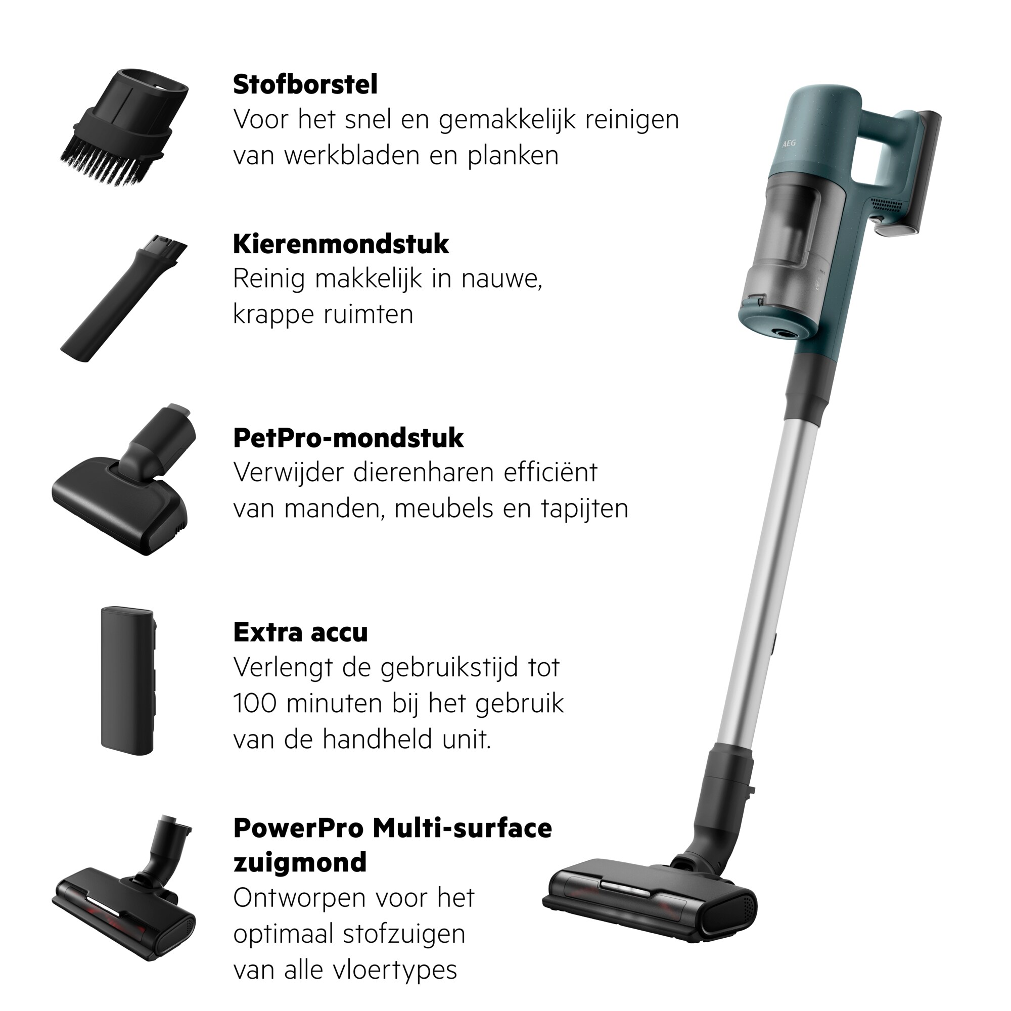 Stofzuig tot 100 minuten* met 1 extra accu