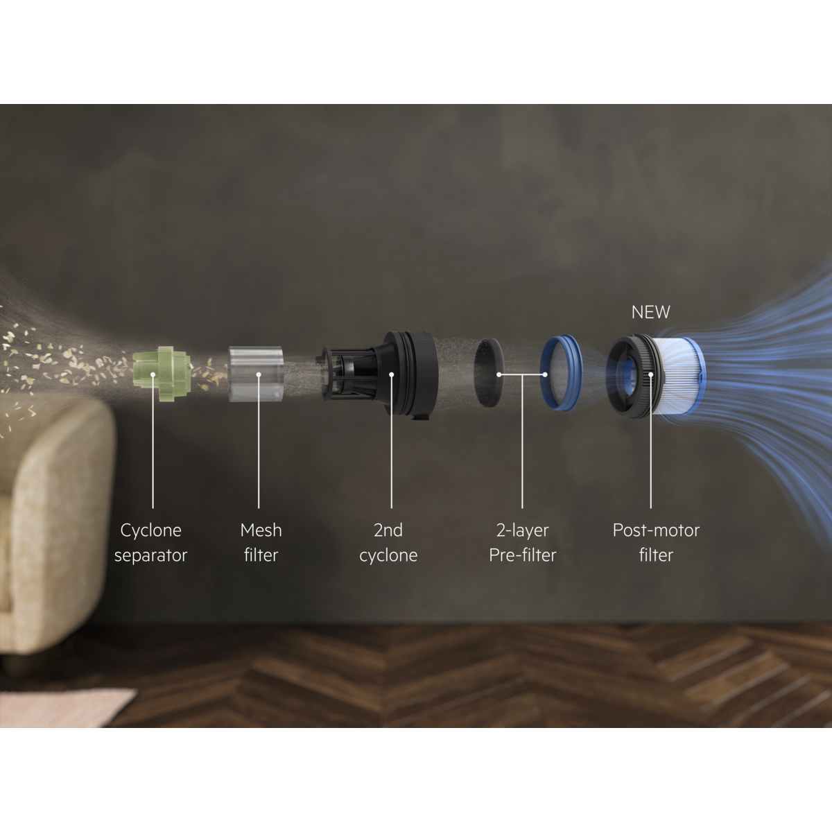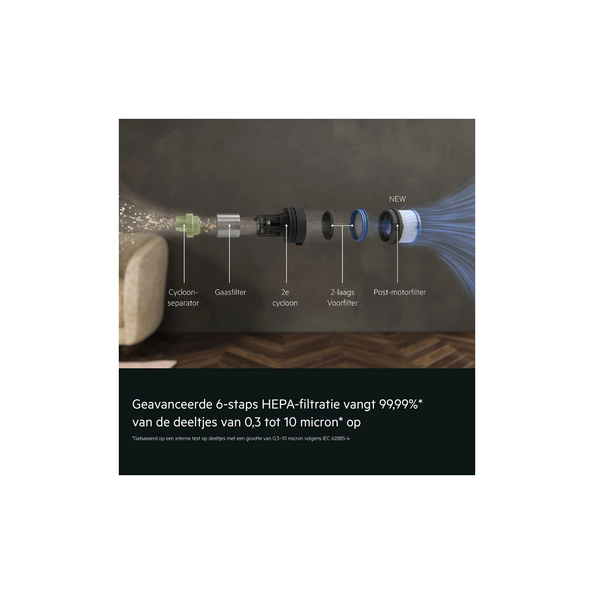 De geavanceerde 6-staps HEPA-filtratie vangt tot 99,99%* van de deeltjes tussen de 0,3 en 10 micron op, inclusief stof, pollen, huidschilfers van huisdieren en schimmelsporen. Het nieuwe post-motorfilter verbetert de filtratie nog verder, zodat er schonere lucht in je huis wordt teruggeblazen.