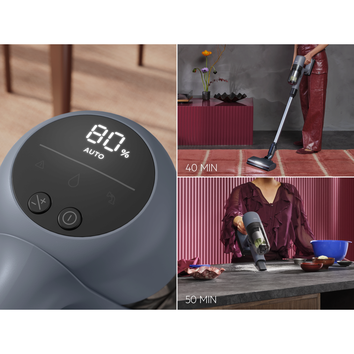 Slim en efficiënt reinigen van alle vloeren met Auto Mode. De sensor past de zuigkracht in real time aan voor optimale prestaties en een lange gebruiksduur*. Altijd de juiste kracht bij de hand. Reinig tot 40 minuten met de volledige stofzuiger**, tot 151 m²*** en tot 50 minuten met de handunit.**
