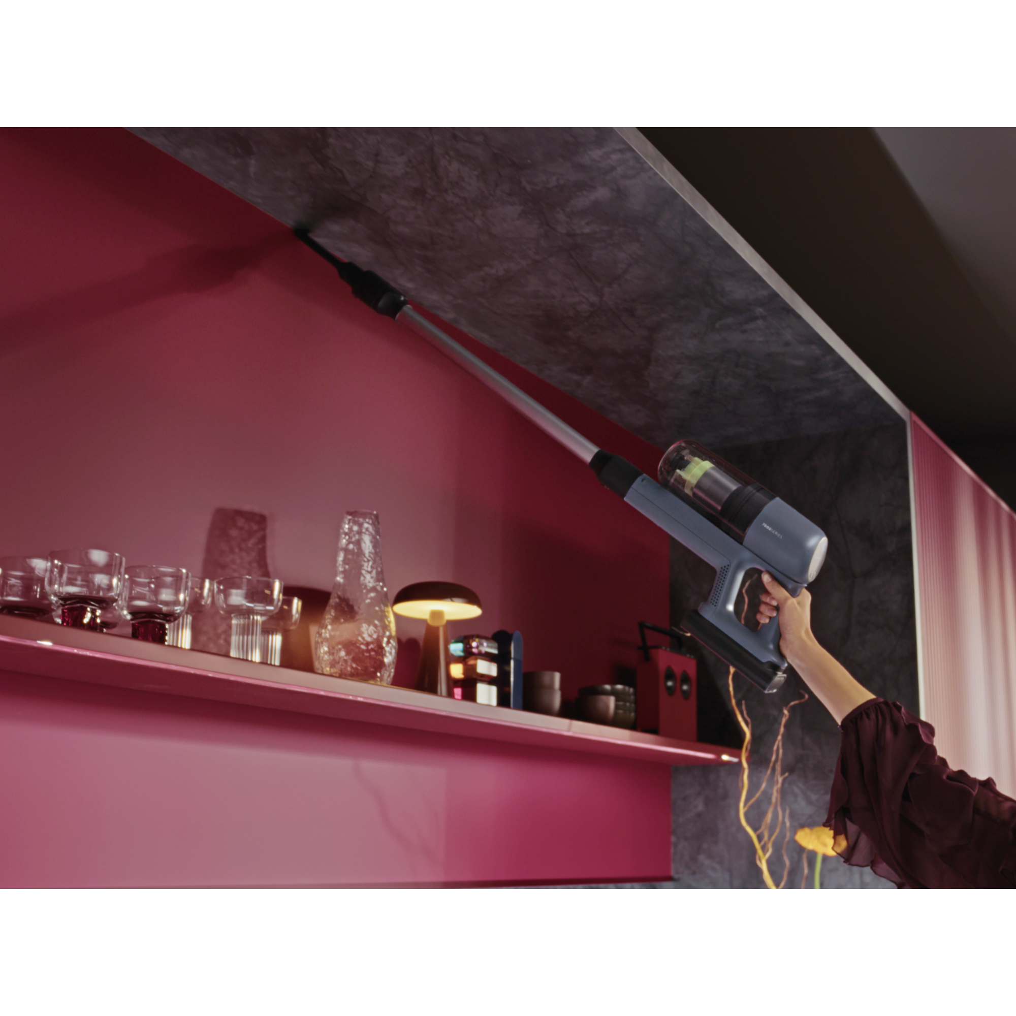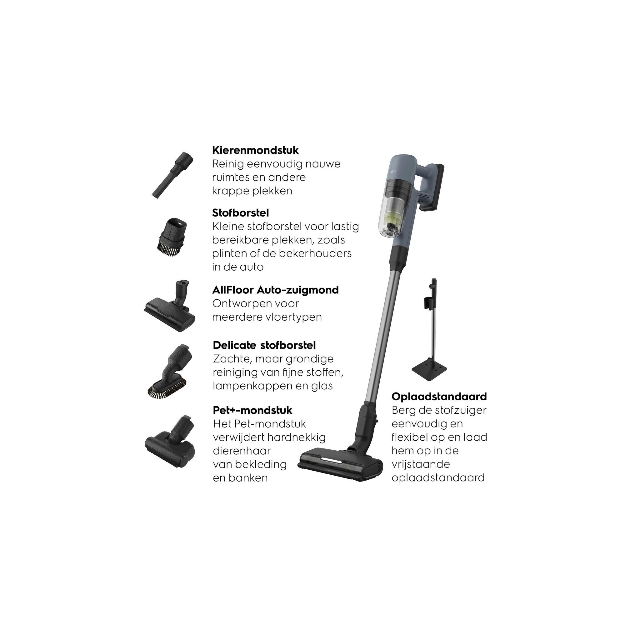 Ervaar krachtige reiniging met een compacte, snoerloze stofzuiger die licht aanvoelt met slechts 1,35 kg. Manoeuvreer moeiteloos dankzij de ergonomische telescopische buis en schakel snel tussen taken met snelklik-accessoires voor veelzijdig en moeiteloos schoonmaken.