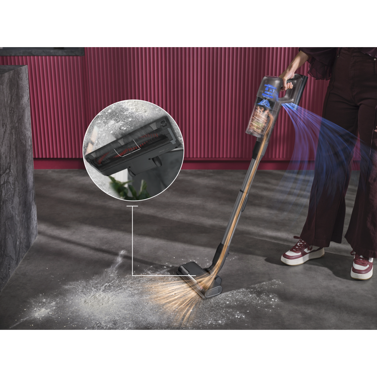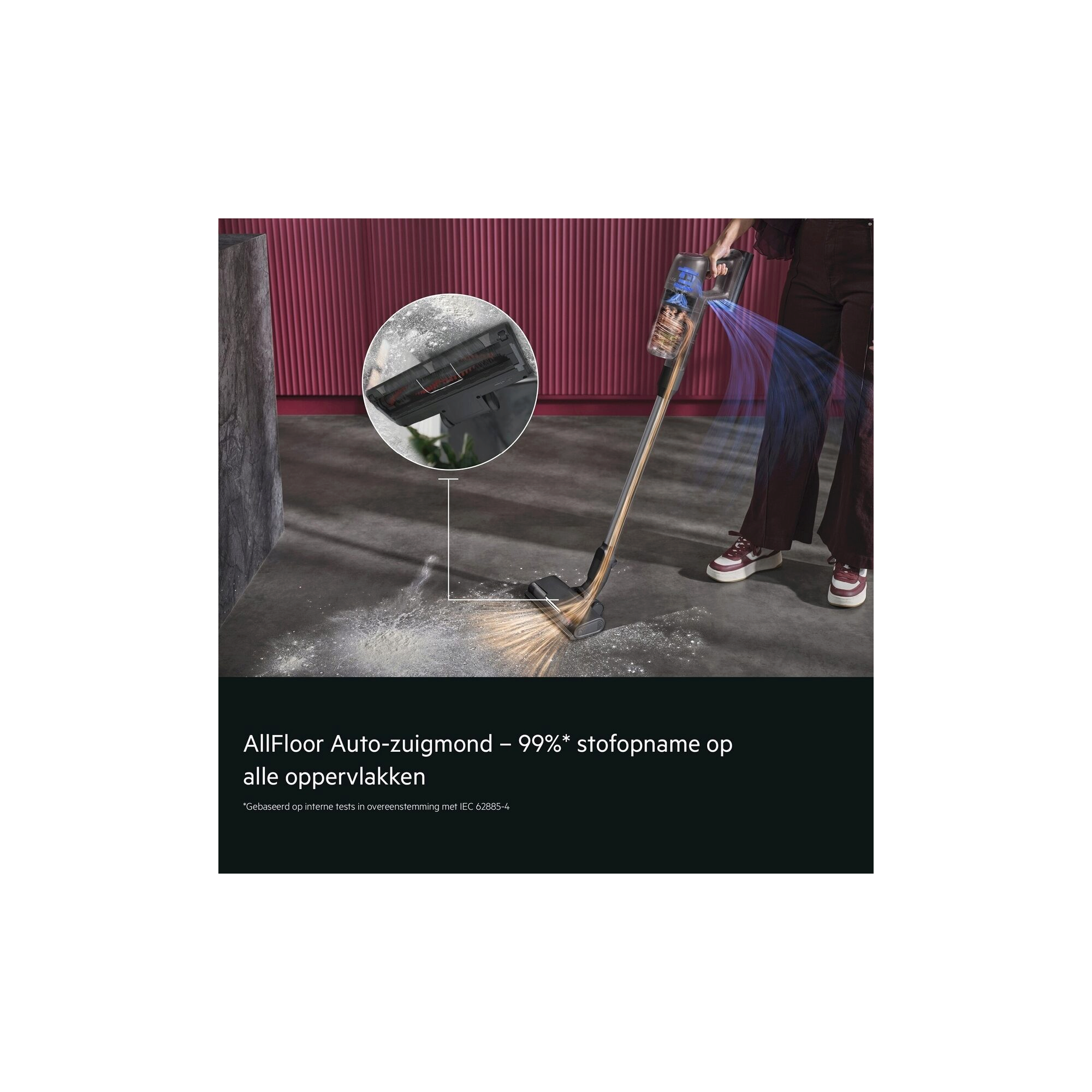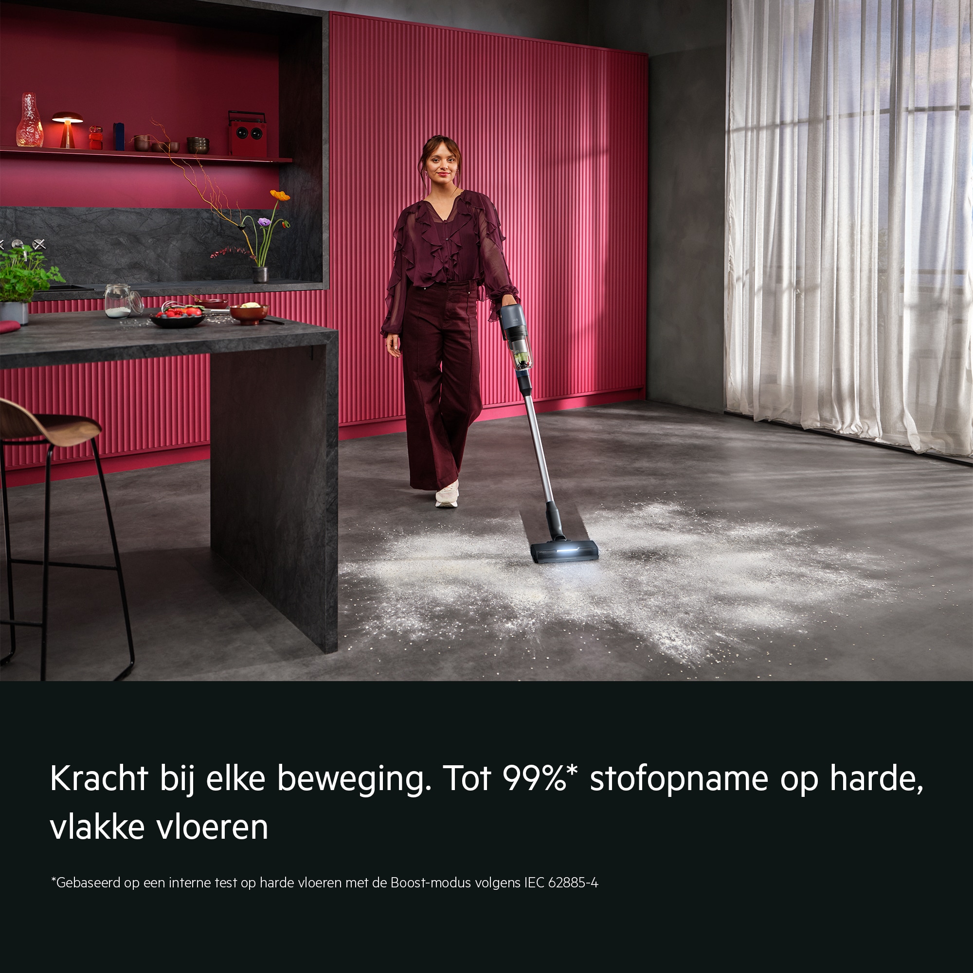 Krachtig in elke zuigbeweging, op elk vloertype – neemt tot 99%* stof op bij voorwaartse én achterwaartse zuigbeweging, voor snel schoonmaken. De AllFloor Auto-zuigmond glijdt soepel over van een harde vloer naar tapijt en zorgt voor een grondige opname van vuil en stof.
