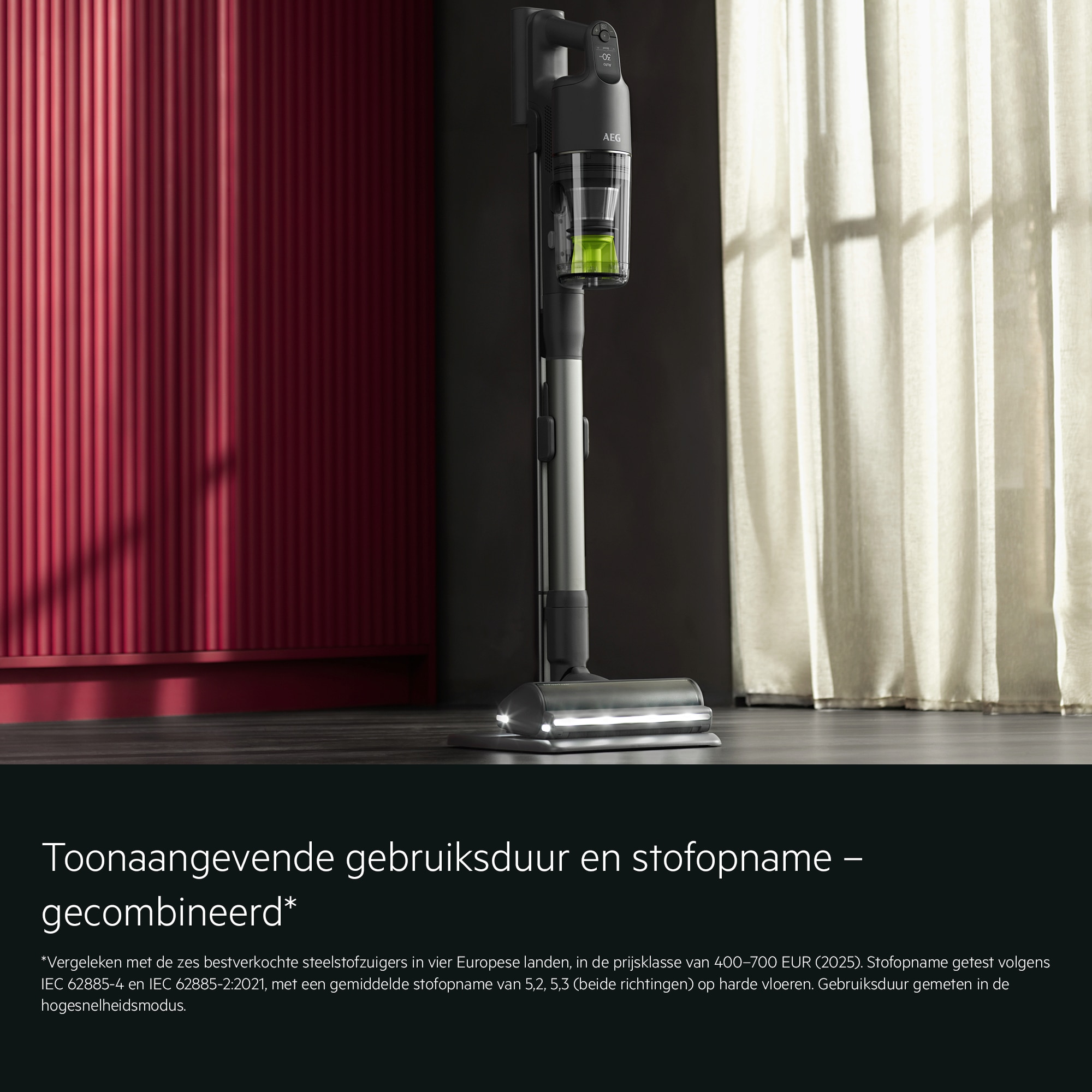 *Vergeleken met de bestverkochte [aant. geteste prod.] steelstofzuigers in 4 Europese landen, prijsklasse € 400–€ 700 (2025). Stofopname getest volgens IEC 62885-4 & IEC 62885-2:2021, met gemiddelde stofopname van 5,2 & 5,3 (beide richtingen) op harde vloeren. Gebruiksduur gemeten in de hoge stand.