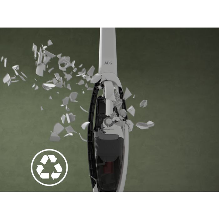 *De hoeveelheid gerecycled kunststof in % verschilt per AEG 5000 draadloze stofzuigermodel van 58-74%.