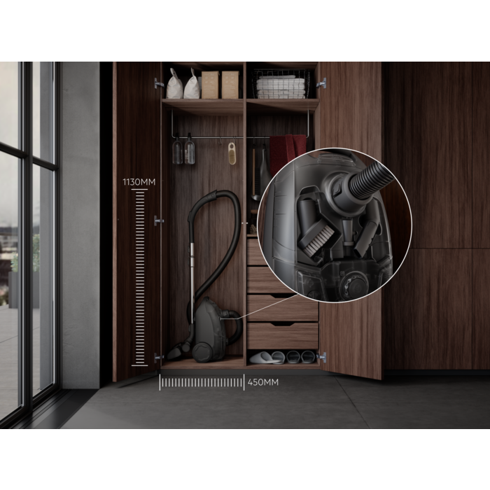 Maak kennis met onze compacte 5000 reiniger met zak, die op efficiënte wijze stof en vuil van alle oppervlakken verwijdert. Naadloze overgang van vloer naar tapijt met de AllFloor-zuigmond, terwijl de ingebouwde opbergruimte je accessoires binnen handbereik houdt.