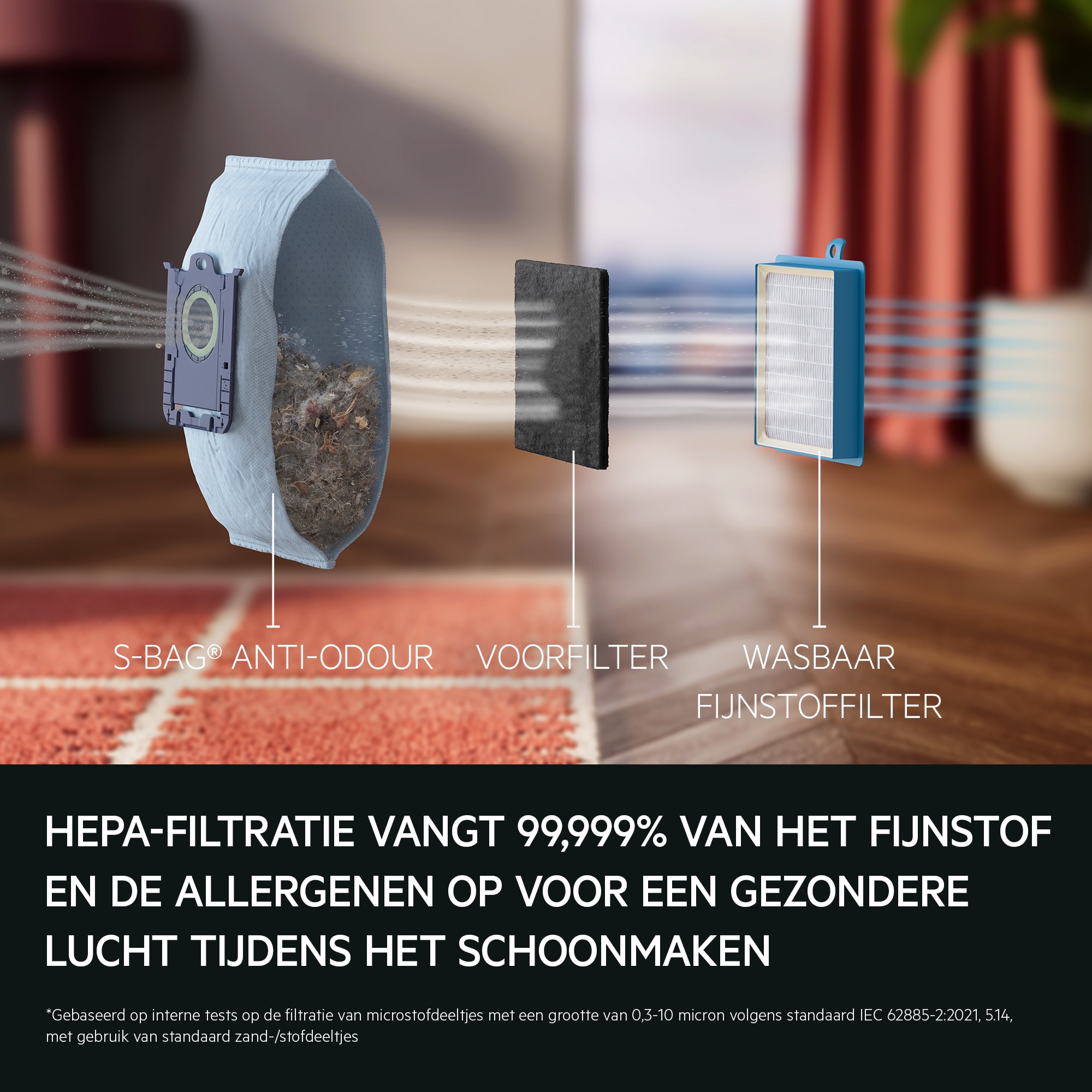 *Gebaseerd op interne tests op de filtratie van microstofdeeltjes met een grootte van 0,3-10 micron volgens standaard IEC 62885-2:2021, 5.14, met gebruik van standaard zand-/stofdeeltjes.