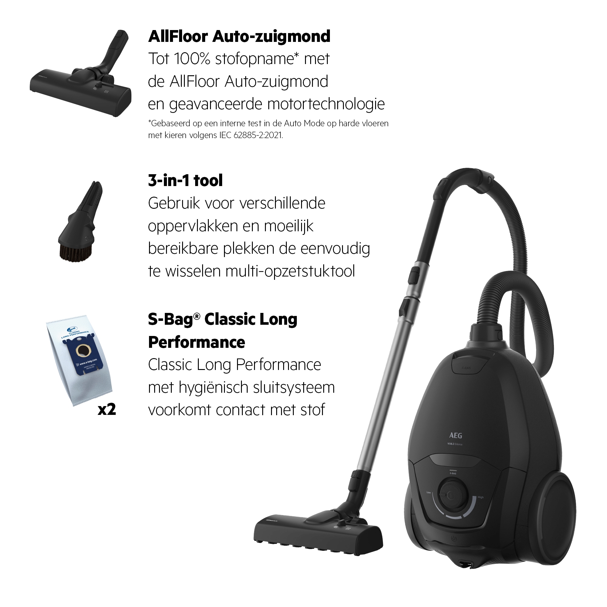 **Gebaseerd op een interne test in de High Mode volgens IEC 62885-2 in vergelijking met de AEG VX8.2