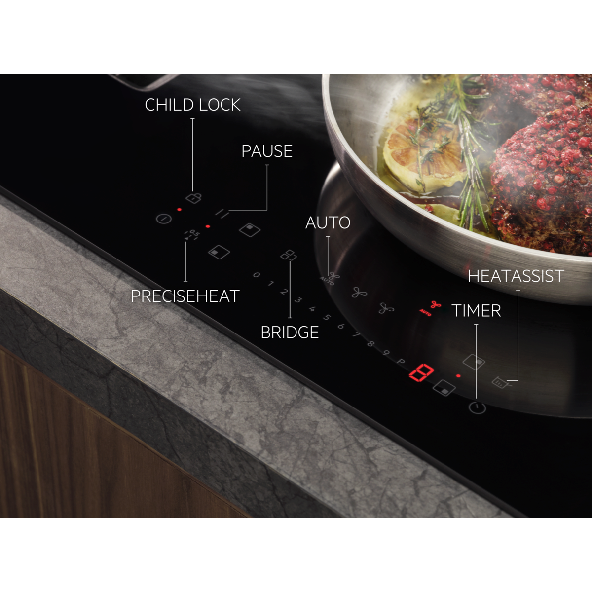 Met de brugfunctie kun je twee aparte kookzones met elkaar verbinden en zo één grote kookzone creëren. Zo wordt de warmte gelijkmatig over het hele oppervlak verdeeld. Handig voor grote pannen of een planchagrill.