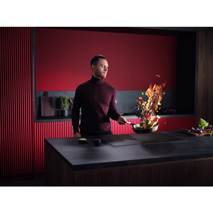 De 6000 serie ComboHob Bridge-kookplaat past in een kast van 60 cm en combineert een inductiekookplaat met een krachtige ingebouwde afzuigkap voor een optimale dampafzuiging. Hij heeft ook een brugfunctie, waarmee je voor groter kookgerei twee kookzones kunt combineren tot één zone.