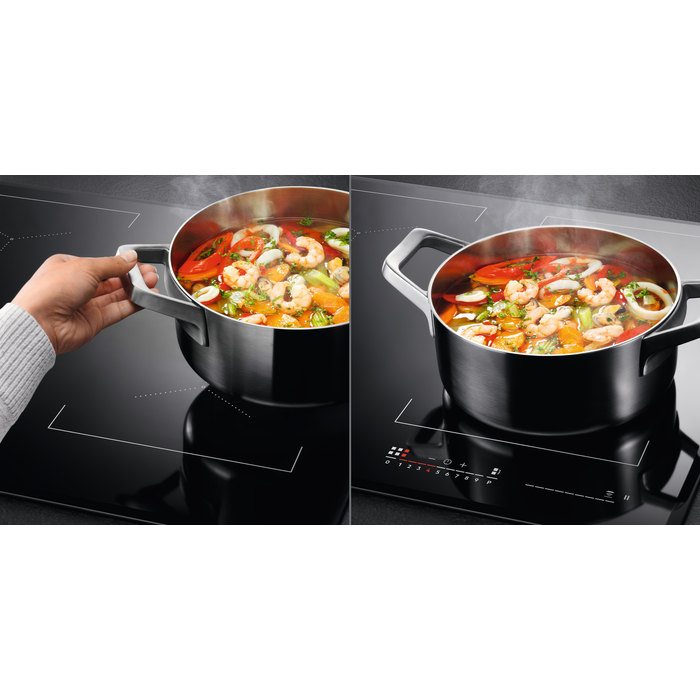 De 6000 TotalFlex-kookplaat detecteert automatisch verschillende vormen potten en pannen en creëert daarvoor een aangepaste kookzone. Dit biedt je de vrijheid om potten en pannen vrijwel overal op het responsieve glazen oppervlak te plaatsen.