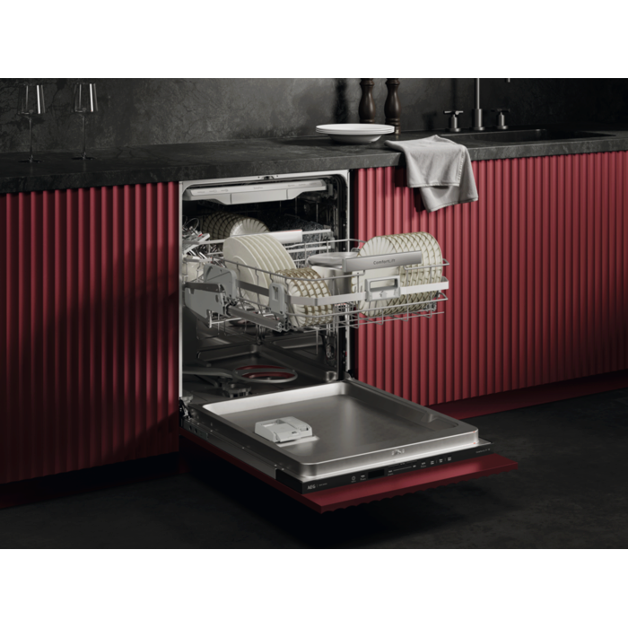 De vernieuwde EasyFlex Plus-korven glijden soepel en hebben drie opklapbare rijen om ruimte te maken voor lastig plaatsbare items. Rubberen grepen en antislip spikes houden wijnglazen stevig op hun plek en voorkomen dat ze tegen elkaar stoten. Zelfs gardes en soeplepels passen in de besteklade.