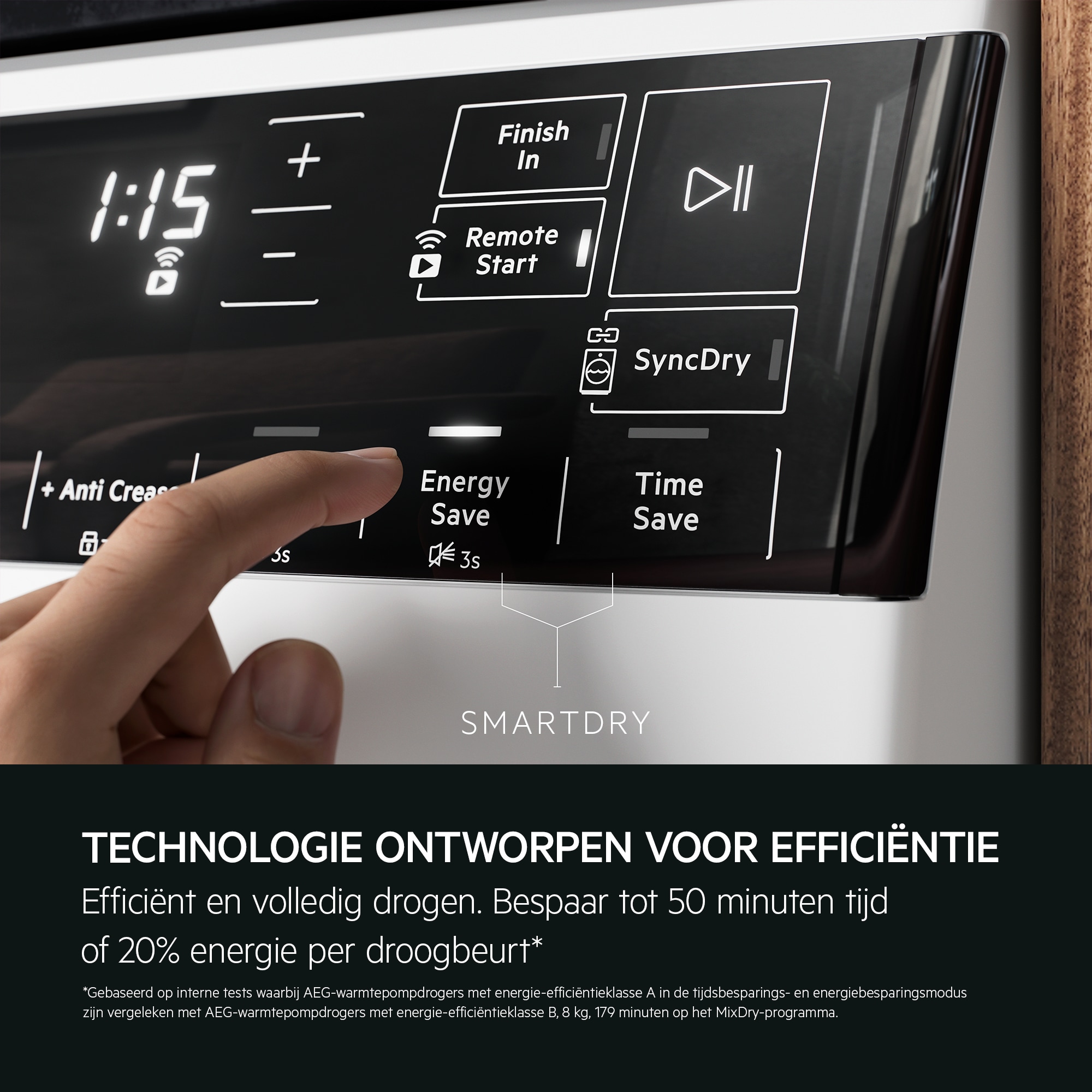 *Gebaseerd op interne tests waarbij AEG warmtepompdrogers van energieklasse A, TimeSave-modus en EnergySave-modus, werden vergeleken met AEG warmtepompdrogers van energieklasse B, 8 kg 179 minuten op MixDry-cyclus.