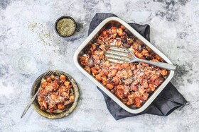 2 Doe de gnocchi samen met de aubergine in een ovenschaal, besprenkel met wat olijfolie en een flinke snuf peper en zout, en stoom zo’n 20 minuten op 99 graden, medium stoom.