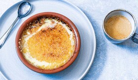 Verdeel, wanneer de crème brûlée is afgekoeld, de rietsuiker over de vormpjes.
