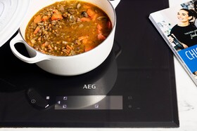 2 Zet de AEG inductieplaat op stand 4, verhit een scheut olie in een braadpan en bak hierin de uien, de winterpeen, de prei, de knoflook en de champignons 3 minuten.