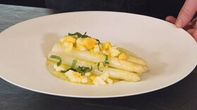 Snijd de vacuumzak open en dresseer de asperges op een bord