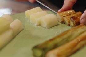 Sterrenchef en AEG ambassadeur David Martin toont je samen met Gaëtan Bartosz het verschil tussen gestoomde en gebakken prei.