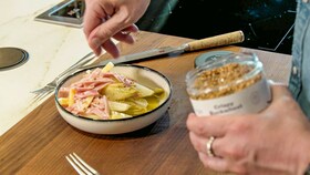 Dresseer samen met de kaas en ham en werk af met een knapperige boekweit.