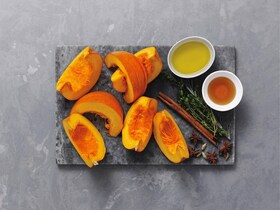 - Snij de pompoen doormidden, verwijder de zaden en snij in 8 schijven. Pluk de blaadjes tijm en de naaldjes van de rozemarijn van de takjes, verkruimel het kaneelstokje en plet de kardemom fijn. Meng dit alles met de olijfolie en de honing.